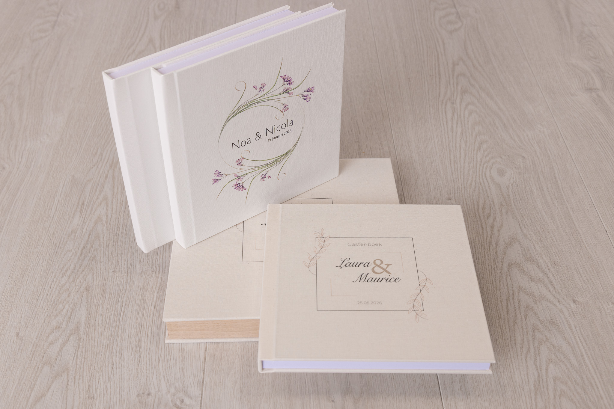 Maak jullie gastenboek helemaal eigen met een harde kaft in luxe linnen of stijlvol kunstleer. Het boek ligt dankzij de stevige binding mooi plat open, waardoor schrijven en bladeren extra gemakkelijk gaat. Upload je eigen ontwerp – zo ontstaat een persoonlijk aandenken voor bruiloften, jubilea, babyshowers of andere bijzondere momenten.