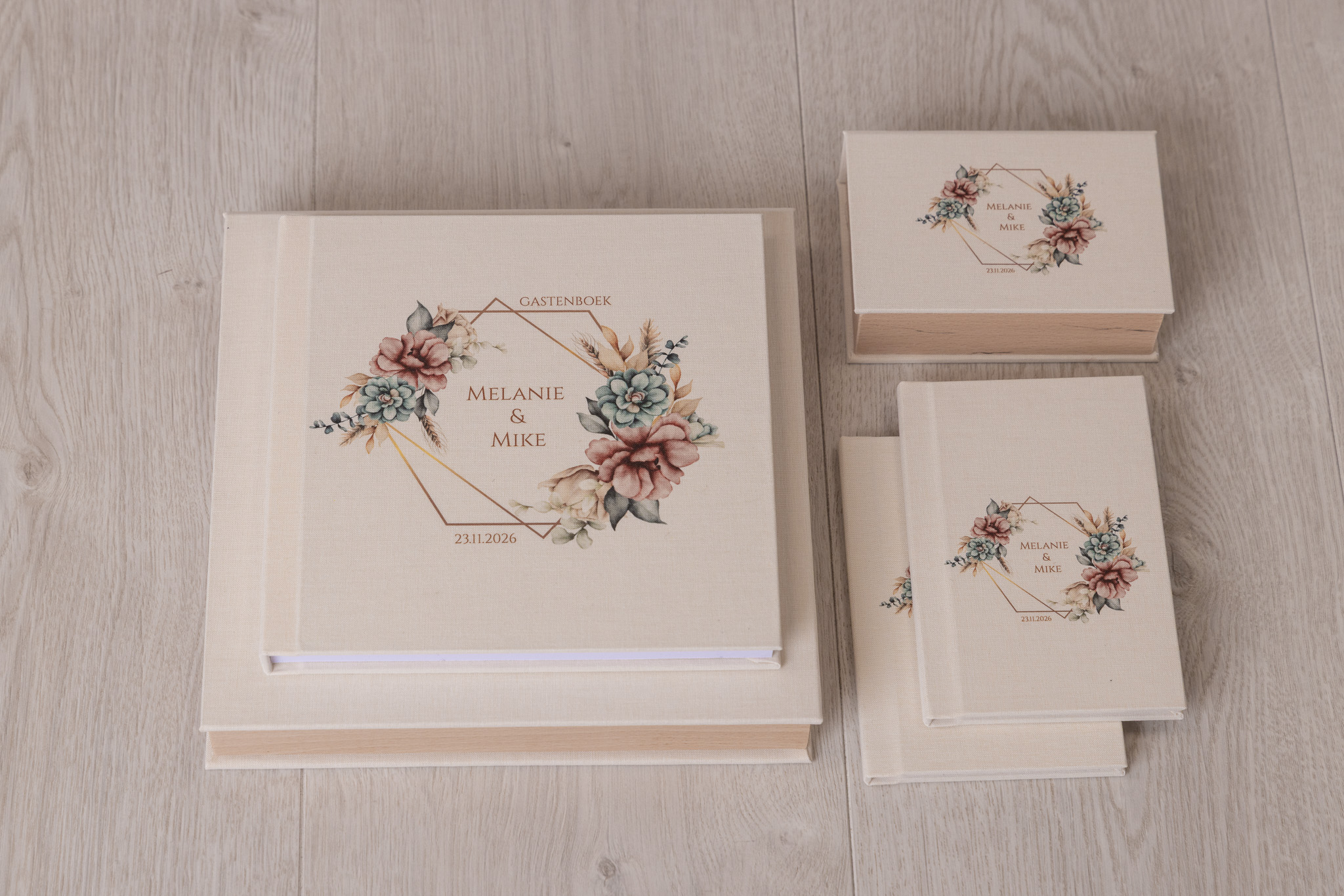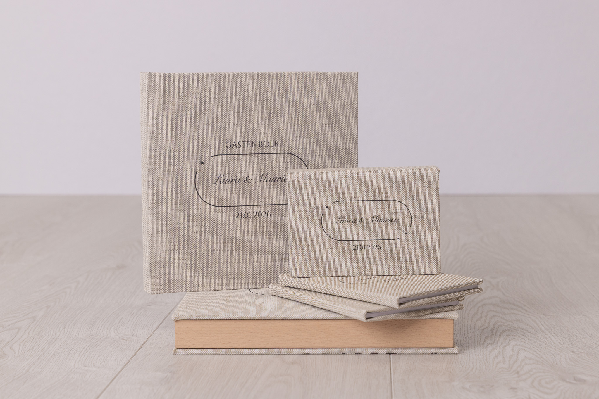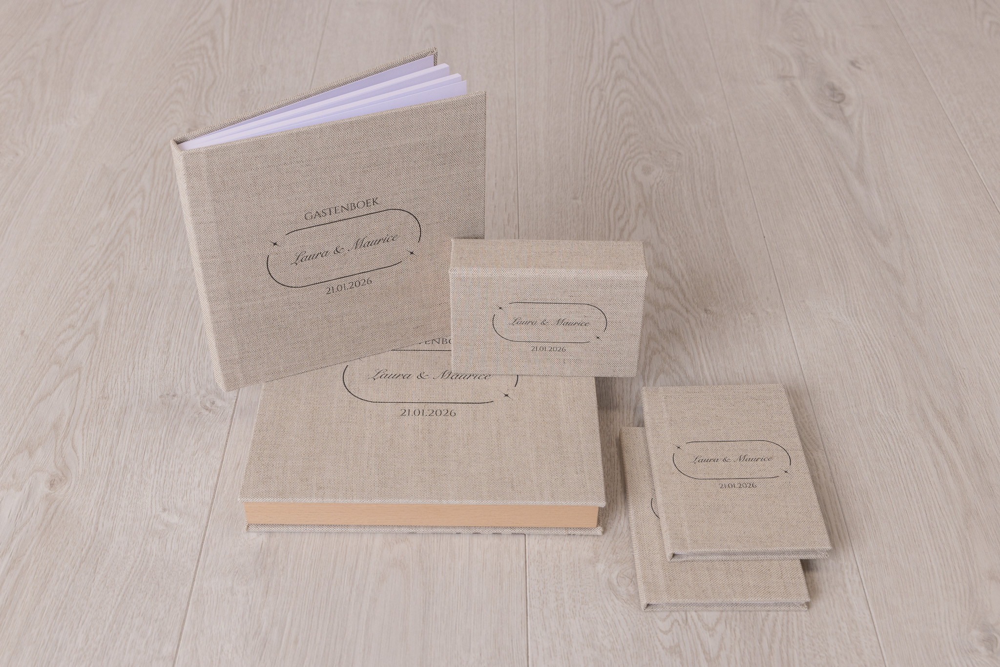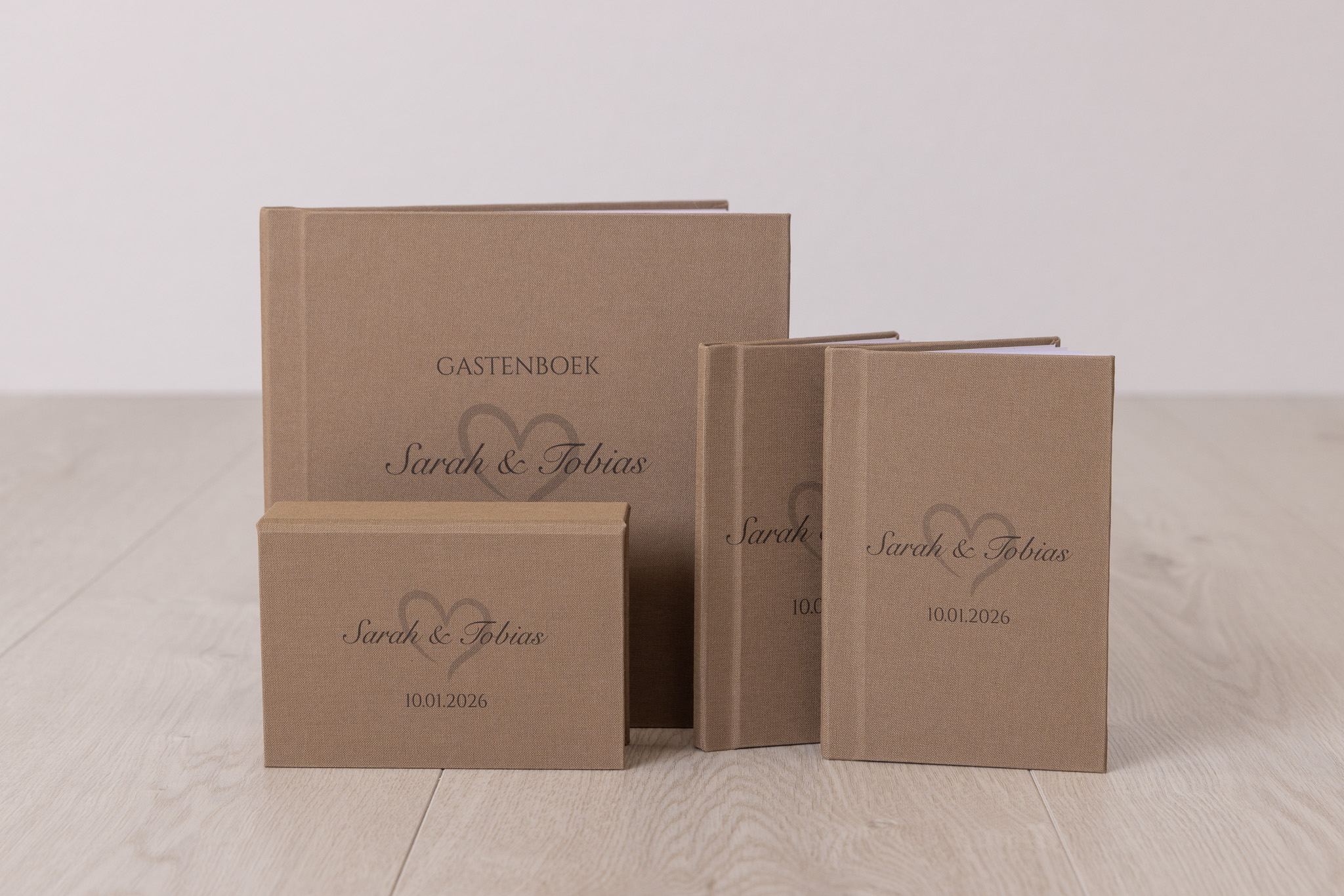 Met onze zorgvuldig samengestelde pakketten vormen alle details één geheel. Elk pakket bevat een gastenboek, bijpassende bewaarbox, een set geloftenboeken en een ringendoos – perfect op elkaar afgestemd in materiaal en uitstraling. Zo creëer je een harmonieuze en complete set waarin alle bijzondere momenten samenkomen en bewaard blijven.